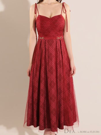 4. 【DEA.by ROBE de FLEURS/ディア】オープンバスト キャミソール チュール チェック柄 ベルトデザイン エレガント Aラインロングドレス (DE3347)