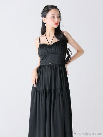 4. 【DEA.by ROBE de FLEURS/ディア】リボン キャミソール ウエストベルト ラメシフォン エレガント オープンバスト ホルターネック Aラインロングドレス (DE3374)