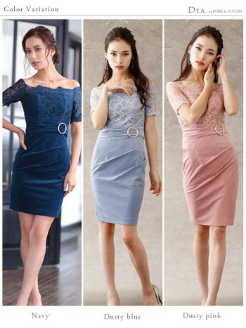 3. 【DEA.by ROBE de FLEURS/ディア】レース シンプルベロア オフショルダー タイトひざ丈ドレス[ダスティーブルー][Lあり][1234]