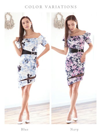 大人かわいいフェミニンな高級キャバ ワンピース♪ 【DEA.by ROBE de FLEURS/ディア】フリル×フラワープリント 袖あり オフショルダー タイトひざ丈ドレス[ブルー][1279a]
