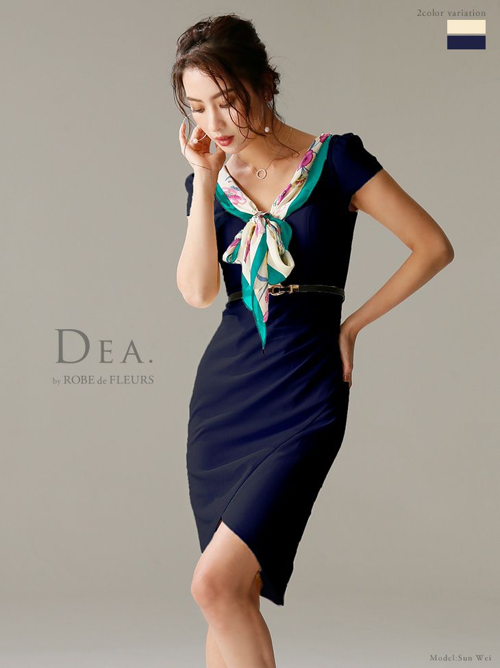 大人かわいいフェミニンな高級キャバ ワンピース♪ 【DEA.by ROBE de FLEURS/ディア】スカーフ風リボン×フレンチスリーブ タイトひざ丈ドレス[ネイビー][Lあり][1417]