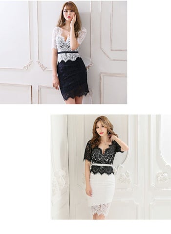 目を引く大柄レースとバイカラーデザインでエレガントな大人ドレス。