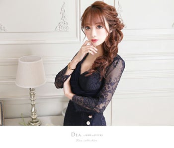 大人かわいいフェミニンな高級キャバ ワンピース♪ 【DEA.by ROBE de FLEURS/ディア】リボンデザイン 刺繍レース長袖 タイトひざ丈ドレス[Lあり][2303]