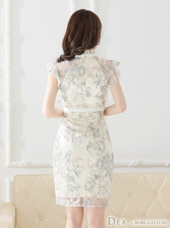 4. 【DEA.by ROBE de FLEURS/ディア】エレガント 花柄レースフリル袖 タイトひざ丈ドレス(DE2584)