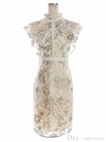 華やかなフラワーレースと袖のフリルがエレガント♪ 【DEA.by ROBE de FLEURS/ディア】エレガント 花柄レースフリル袖 タイトひざ丈ドレス(DE2584)