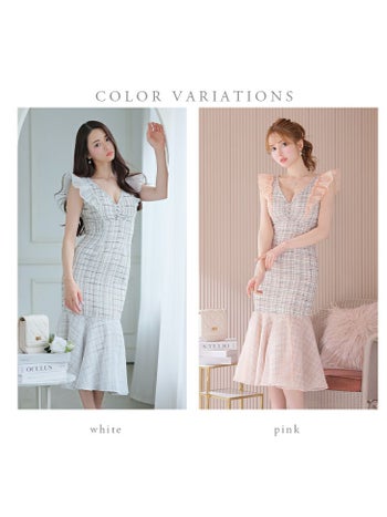 DEA by ROBEdeFLEURS[ディア バイ ローブドフルール]チェックツイード 肩フリル オーガンジー マーメイド タイト 高級ミディドレス[ホワイト][Lあり][るな/キャバドレス着用][2919]