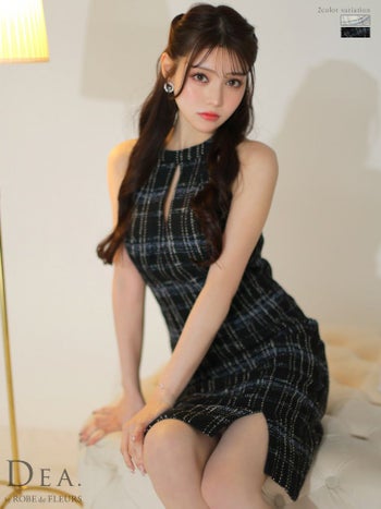 Lあり!同伴やお食事にもおすすめのデザイン★ 【DEA.by ROBE de FLEURS/ディア】チェック柄 ツイード オープンバスト アメリカンスリーブ ワンピース ひざ丈ドレス(DE3156)