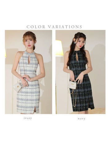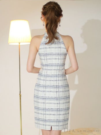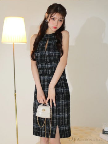 4. 【DEA.by ROBE de FLEURS/ディア】チェック柄 ツイード オープンバスト アメリカンスリーブ ワンピース ひざ丈ドレス(DE3156)