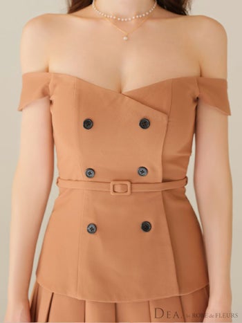 3. 【DEA.by ROBE de FLEURS/ディア】オフショルダー ダブルボタン セットアップ プリーツスカート ワンカラー ウエストベルト フレアミニドレス (DE4315)