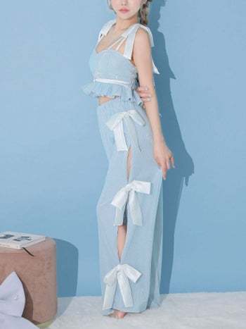 3. 【ルームウェア】【Deco Lingerie/デコランジェリー】セットアップ キャミソール ラメ シフォン ラブリー リボン ロングパンツ ルームウェア 2点セット[キャミソール/ボトムス](DLPJ02)