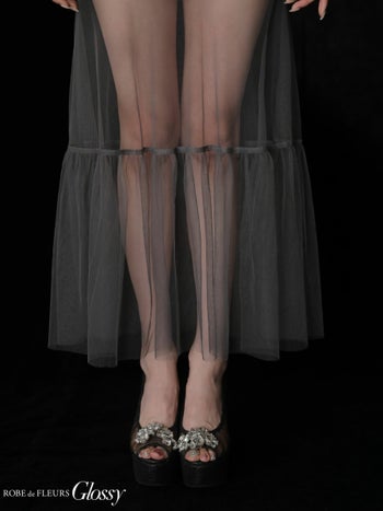 キャバドレス Glossy ROBE de FLEURS グロッシー ローブドフルール オフショルダー ラメニット セットアップ チュール シースルー ドレープ Aラインロングドレス