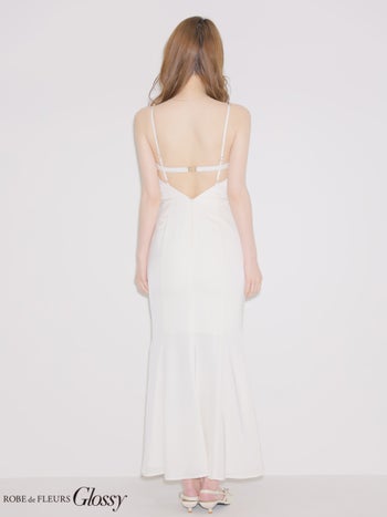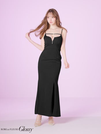 4. 【Glossy by ROBE de FLEURS/グロッシー】ジップデザイン バックシャン キャミソール コードデザイン チェーンショルダー サテン スリット ワンカラー マーメイドロングドレス (GL4177)