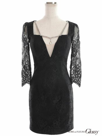 5. 【Glossy by ROBE de FLEURS/グロッシー】シンプル ラインビジュー レース袖あり タイトミニドレス(GL2826)