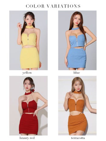 4. 【Glossy by ROBE de FLEURS/グロッシー】セクシー オープンバスト ホルターネック チェーン リボン ワンカラー ジップデザイン セットアップ タイトミニドレス(GL3332)