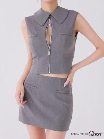 XSあり!セクシーさ全開☆ 【Glossy by ROBE de FLEURS/グロッシー】襟付き ジップデザイン オープンバスト ノースリーブ バックオープン セットアップ セクシー タイトミニドレス (GL3925)