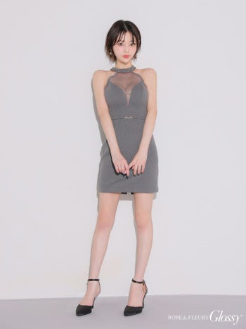 4. 【Glossy by ROBE de FLEURS/グロッシー】シアー ワッフル チュール セクシー ホルターネック ウエストベルト タイトミニドレス (GL3942)