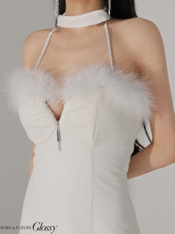 キャバドレス Glossy by ROBE de FLEURS グロッシー ホルターネック チョーカー バックリボン ファー付き ジップデザイン ベロア セクシー タイトミニドレス