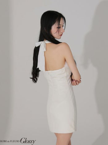 4. 【Glossy by ROBE de FLEURS/グロッシー】ホルターネック チョーカー バックリボン ファー付き ジップデザイン ベロア セクシー タイトミニドレス (GL3949)