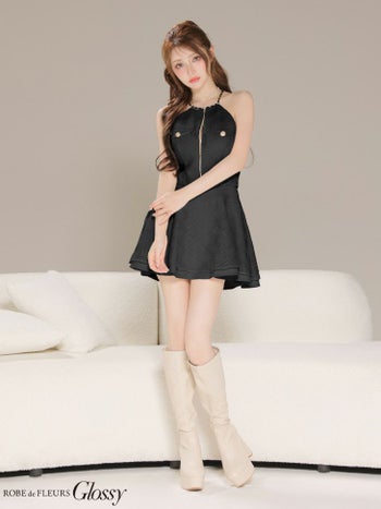 3. 【Glossy by ROBE de FLEURS/グロッシー】ホルターネック ジップデザイン チェック柄 レース ツイル セットアップ モード フレアミニドレス (GL4218)