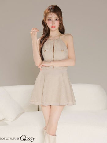 XSあり!高級感抜群☆ 【Glossy by ROBE de FLEURS/グロッシー】ジップデザイン チェック柄 レース ツイル セットアップ モード ホルターネック フレアミニドレス (GL4218)