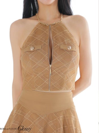 キャバドレス Glossy by ROBE de FLEURS グロッシー ジップデザイン チェック柄 レース ツイル セットアップ モード ホルターネック フレアミニドレス