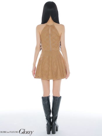 4. 【Glossy by ROBE de FLEURS/グロッシー】ジップデザイン チェック柄 レース ツイル セットアップ モード ホルターネック フレアミニドレス (GL4218)