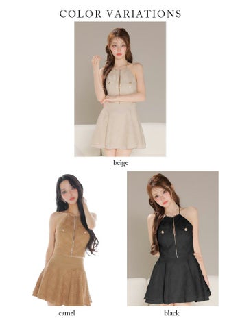 3. 【Glossy by ROBE de FLEURS/グロッシー】ジップデザイン チェック柄 レース ツイル セットアップ モード ホルターネック フレアミニドレス (GL4218)