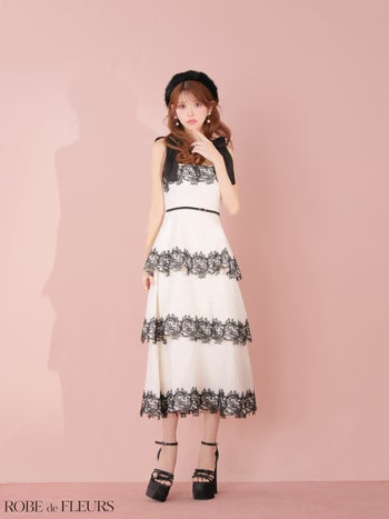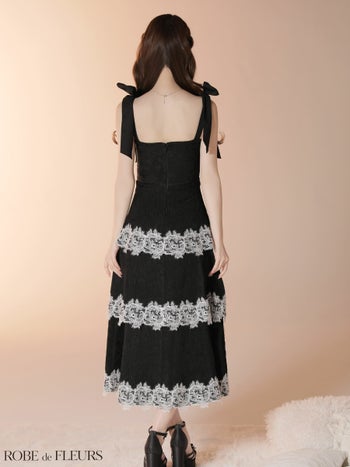 3. 【ROBEdeFLEURS/ローブドフルール】ノースリーブ ショルダーリボン ウエストベルト ジャガード チュールレース ティアードスカート Aラインロングドレス (fm3487)