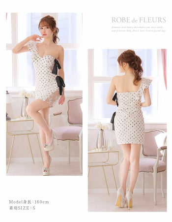 3. 【ROBEdeFLEURS/ローブドフルール】ドット フラワーレースサイドリボンフリル ワンショルダー タイトミニドレス[真優川咲/高級キャバドレス着用][2937]