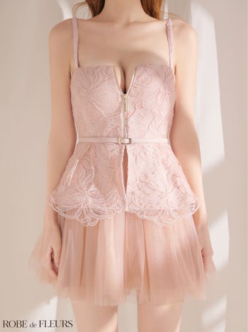 4. 予約商品【4月中旬入荷予定】【ROBEdeFLEURS/ローブドフルール】キャミソール フラワーレース ジップデザイン ペプラム ドッキング チュール フレアミニドレス (fm3494)