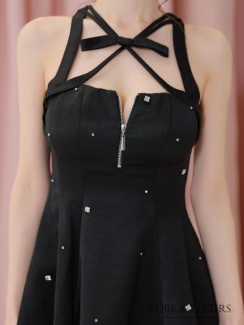 キャバドレス ROBEdeFLEURS ローブドフルール ネックリボン ジップデザイン ガーリー サテン ノースリーブ ビジュー フレアミニドレス