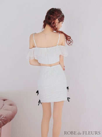 4. 【ROBEdeFLEURS/ローブドフルール】ラメチュール ガーリー フリルオフショルダー ミニリボン セットアップ タイトミニドレス(fm3602)