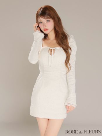 5. 予約商品【10月上旬入荷予定】【ROBEdeFLEURS/ローブドフルール】スカラップレース リボン 長袖 ストーン バックオープン ベロア タイトミニドレス (fm4124)