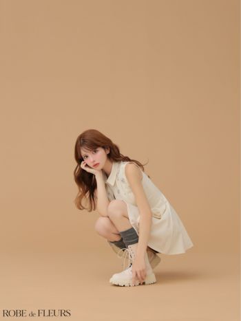 4. 【ROBEdeFLEURS/ローブドフルール】プリーツスカート ジップデザイン ノースリーブ 襟付き クラシカル フレアミニドレス (fm4156)