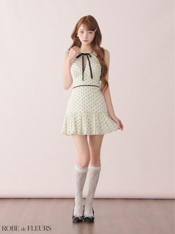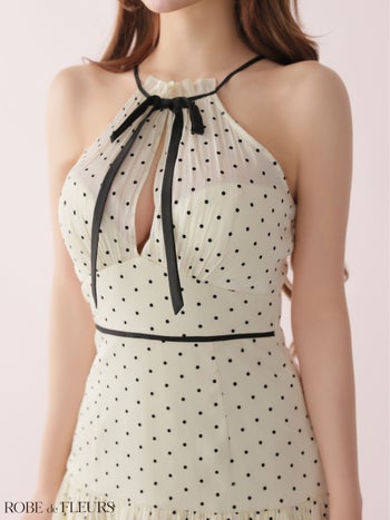 4. 予約商品【3月中旬入荷予定】【ROBEdeFLEURS/ローブドフルール】ホルターネック リボン オーガンジー ガーリー ドット柄 フレアミニドレス (fm4165)