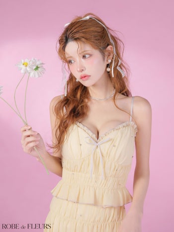 3. 予約商品【4月中旬入荷予定】【ROBEdeFLEURS/ローブドフルール】リボン ビジュー ラメシフォン フリル セットアップ キャミソール フレアミニドレス (fm4183)