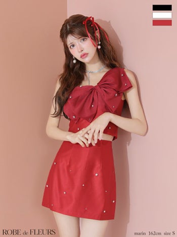 3. 【ROBEdeFLEURS/ローブドフルール】ビッグリボン オーガンジー セットアップ ワンショルダー ガーリー タイトミニドレス (fm4202)