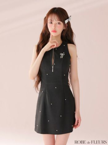 4. 【ROBEdeFLEURS/ローブドフルール】ノースリーブ ビジュー リボン ジップデザイン パール フレアミニドレス(fm4214)