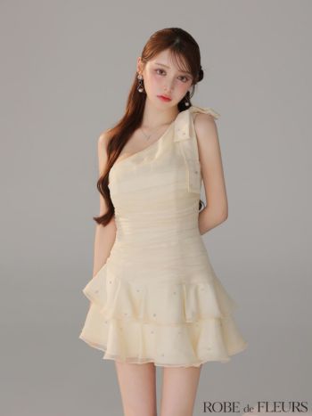 4. 【ROBEdeFLEURS/ローブドフルール】ワンショルダー ビッグリボン ビジュー アシンメトリー フリル ティアードスカート ガーリー フレアミニドレス (fm4322)
