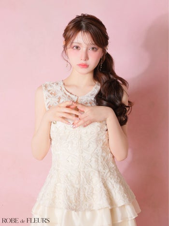 キャバドレス ROBEdeFLEURS ローブドフルール ゴールドボタン ペプラム ティアード フラワーレース セットアップ ノースリーブ バストカット フレアミニドレス
