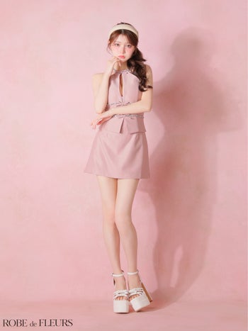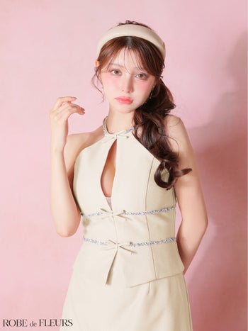 4. 【ROBEdeFLEURS/ローブドフルール】ラメツイル ビジュー リボン ガーリー ホルターネック セットアップ タイトミニドレス (fm4343)