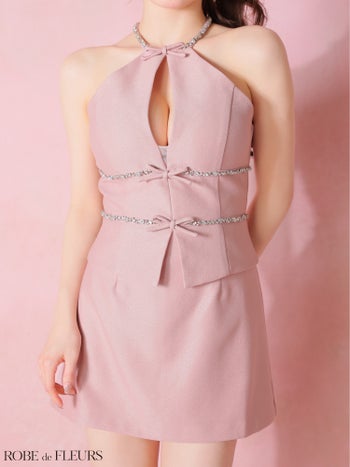 3. 【ROBEdeFLEURS/ローブドフルール】ラメツイル ガーリー ホルターネック セットアップ ビジュー リボン タイトミニドレス (fm4343)