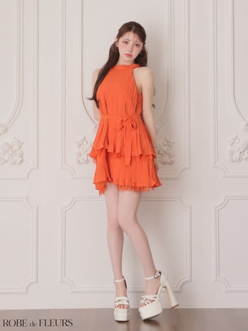 4. 予約商品【5月上旬入荷予定】【ROBEdeFLEURS/ローブドフルール】ワンカラー プリーツ ホルターネック シフォン ウエストリボン フレアミニドレス (fm4614)