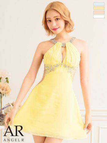 XSあり!煌めくビジューが存在感抜群☆ SALE【Angel R/エンジェルアール】デコルテビジュー ホルターネック タックデザイン シフォン フレアミニドレス (AR24320)