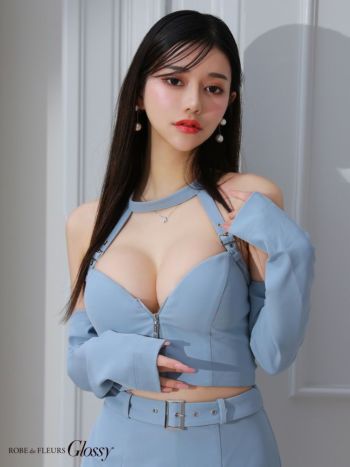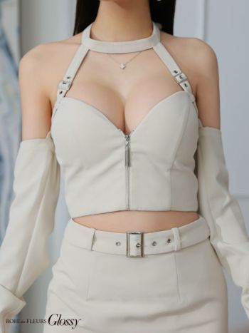 3. SALE【Glossy by ROBE de FLEURS/グロッシー】バックリボン ジップデザイン ホルターネック 2way オフショルダー 長袖 ベルトセットアップ タイトミニドレス(GL3171)