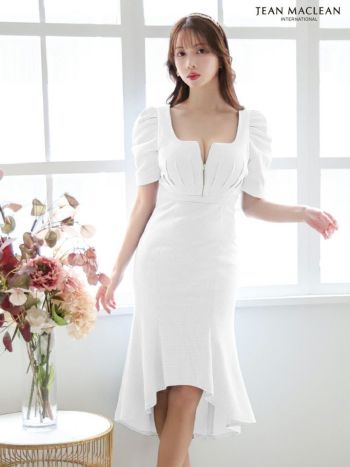4. SALE【JEANMACLEAN/ジャンマクレーン】エレガント 袖あり ジップデザイン オープンバスト フリル 膝丈ドレス (45984)