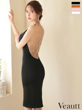 4. SALE【Veautt/ヴュート】オープンバック クロスパールビジュー ホルターネック フロントジップデザイン ミディアム タイト ひざ丈ドレス(VT032403)