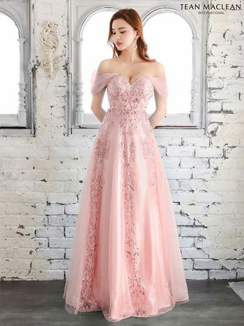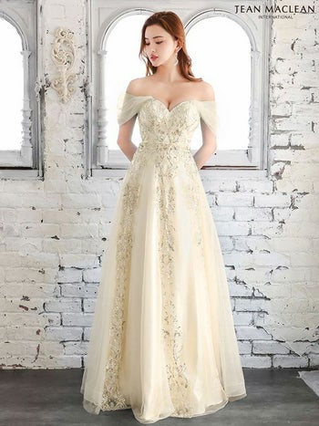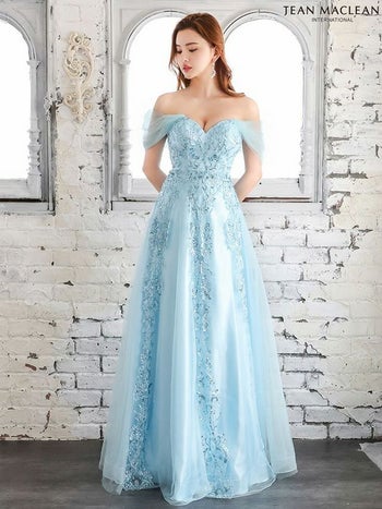 Lあり!イベントや特別な日にぴったり♪ SALE【JEANMACLEAN/ジャンマクレーン】オフショルダー バースデー ラメ刺繍デザイン Aラインロングドレス (21266)