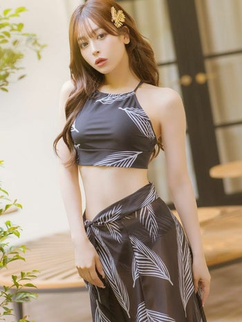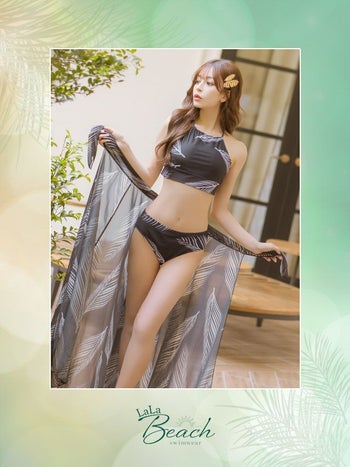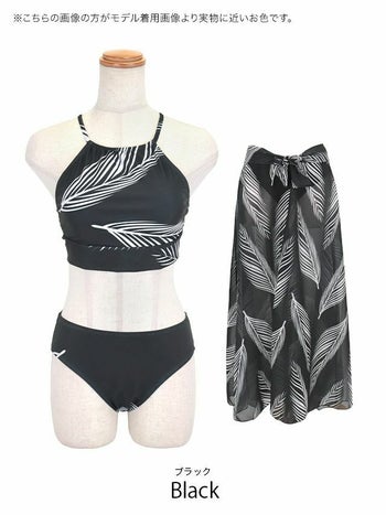 3. SALE【水着】2Way アメリカンスリーブ モノトーンリーフ パレオ付き ビキニ