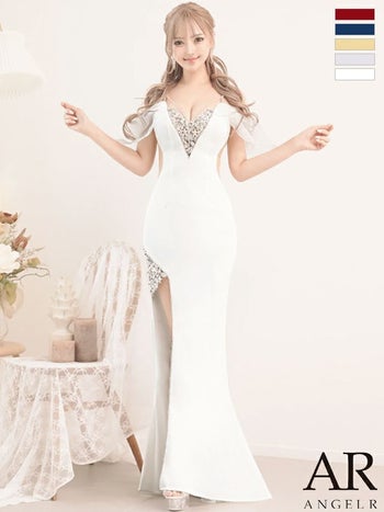 4. 【Angel R/エンジェルアール】フラワービジュー パール セクシー スリット オフショルダー くびれ透け タイトロングドレス (AR24336)